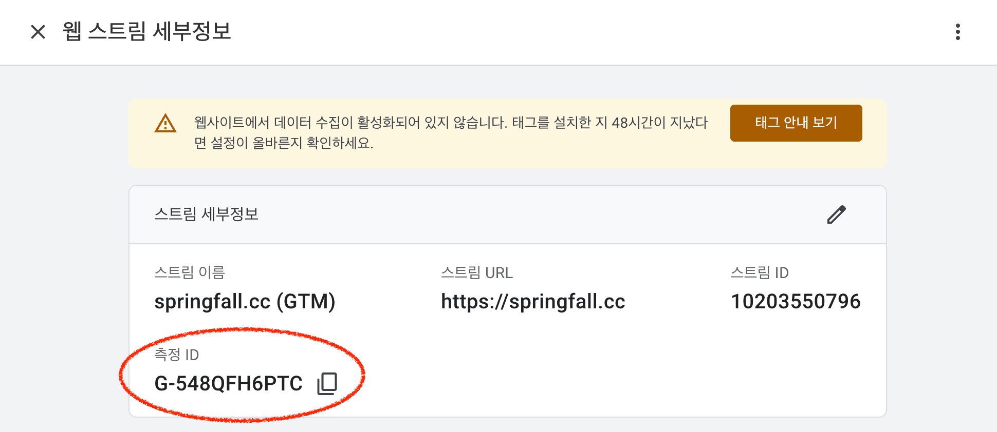 태그는 수동으로 (GTM을 통해) 설치할 것입니다. 아래 이미지처럼 측정 ID를 잘 복사해놓고 있읍시다.